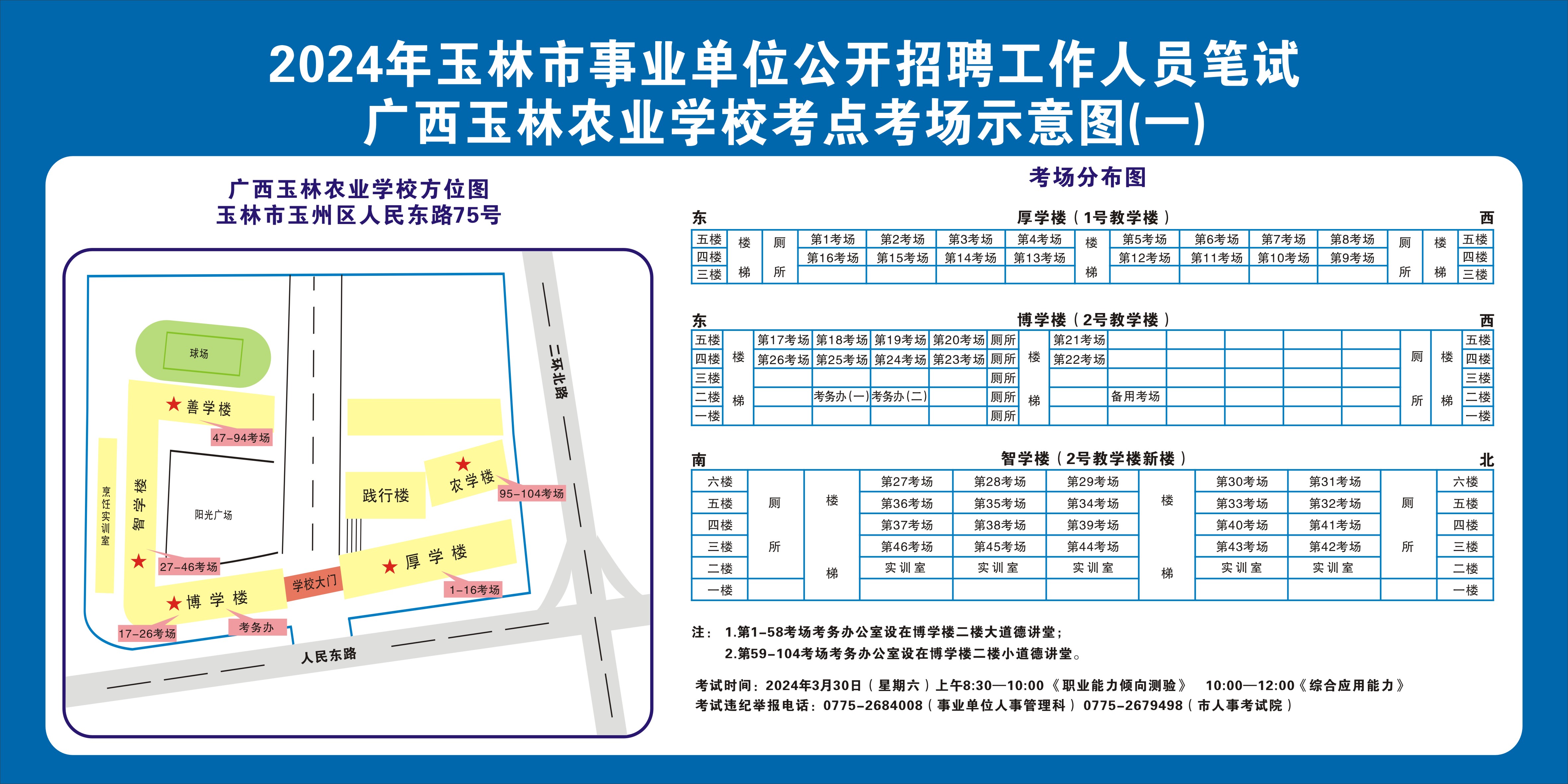 需要特別注意的是:玉林市第一職業(yè)中等專業(yè)學(xué)??键c(diǎn)是設(shè)在該校的東校區(qū)(人民東路東235號(hào));玉林市第一中學(xué)考點(diǎn)是設(shè)在該校的運(yùn)嶺路校區(qū)(二環(huán)北路1228號(hào))!