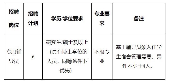 (四)年齡不超過30周歲,即1993年12月1日及之后出生;具有博士學(xué)位的,或具有高級(jí)職稱的,或有專職輔導(dǎo)員工作經(jīng)驗(yàn)且在各類輔導(dǎo)員職業(yè)能力競(jìng)賽、輔導(dǎo)員評(píng)優(yōu)評(píng)先等活動(dòng)中獲得過省部級(jí)(含)以上獎(jiǎng)勵(lì)表彰者,年齡可放寬至35周歲,即1988年12月1日及之后出生。