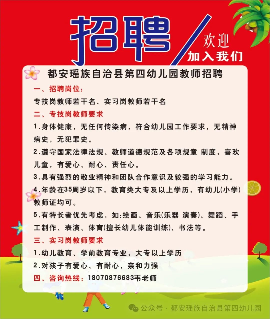 安瑤族自治縣第四幼兒園誠(chéng)聘教師與廚房工作人員若干人