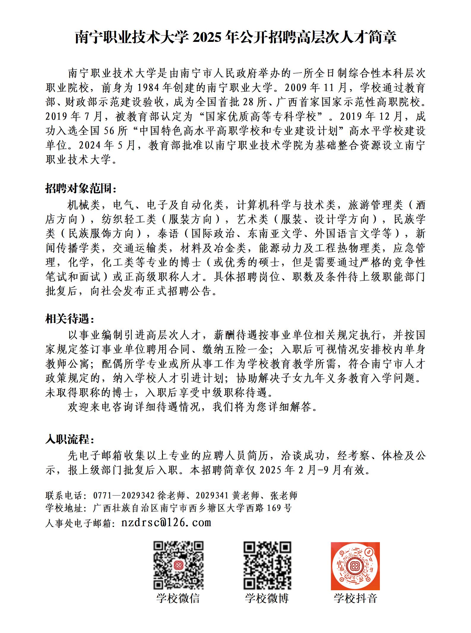 南寧職業(yè)技術(shù)大學(xué)2025年招聘高層次人才簡章