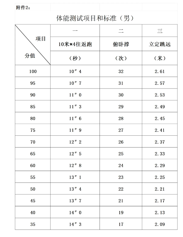 3.體能測試。參照人民警察招錄標(biāo)準(zhǔn)執(zhí)行(具體項目和標(biāo)準(zhǔn)詳見附件2)。測試項目:10米×4往返跑、立定跳遠(yuǎn)、俯臥撐,體能測試三項全部達(dá)標(biāo)的,方為合格。