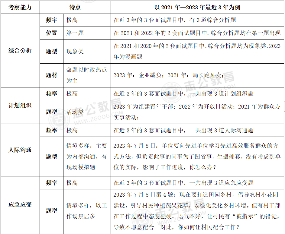 貴港事業(yè)單位面試主要采用結(jié)構(gòu)化面試形式;審題時間:2分鐘;答題時間:12分鐘;考查題量:4題為主??紕?wù)情況:考官不讀題、統(tǒng)一計時、超時會提醒??疾轭}型:綜合分析(極高)、計劃組織(極高)、人際溝通(極高)、應(yīng)急應(yīng)變(較高)、貫徹執(zhí)行(較高)、自我認(rèn)知(一般)。
