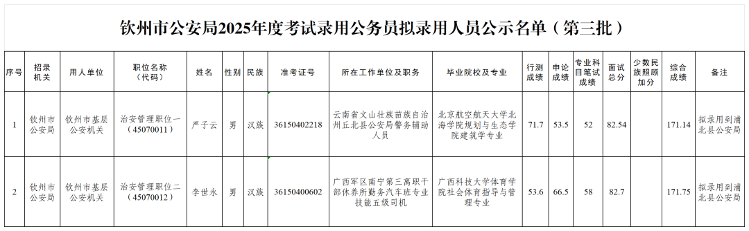 16 欽州市2025年度考試錄用公務(wù)員擬錄用人員公示(八)