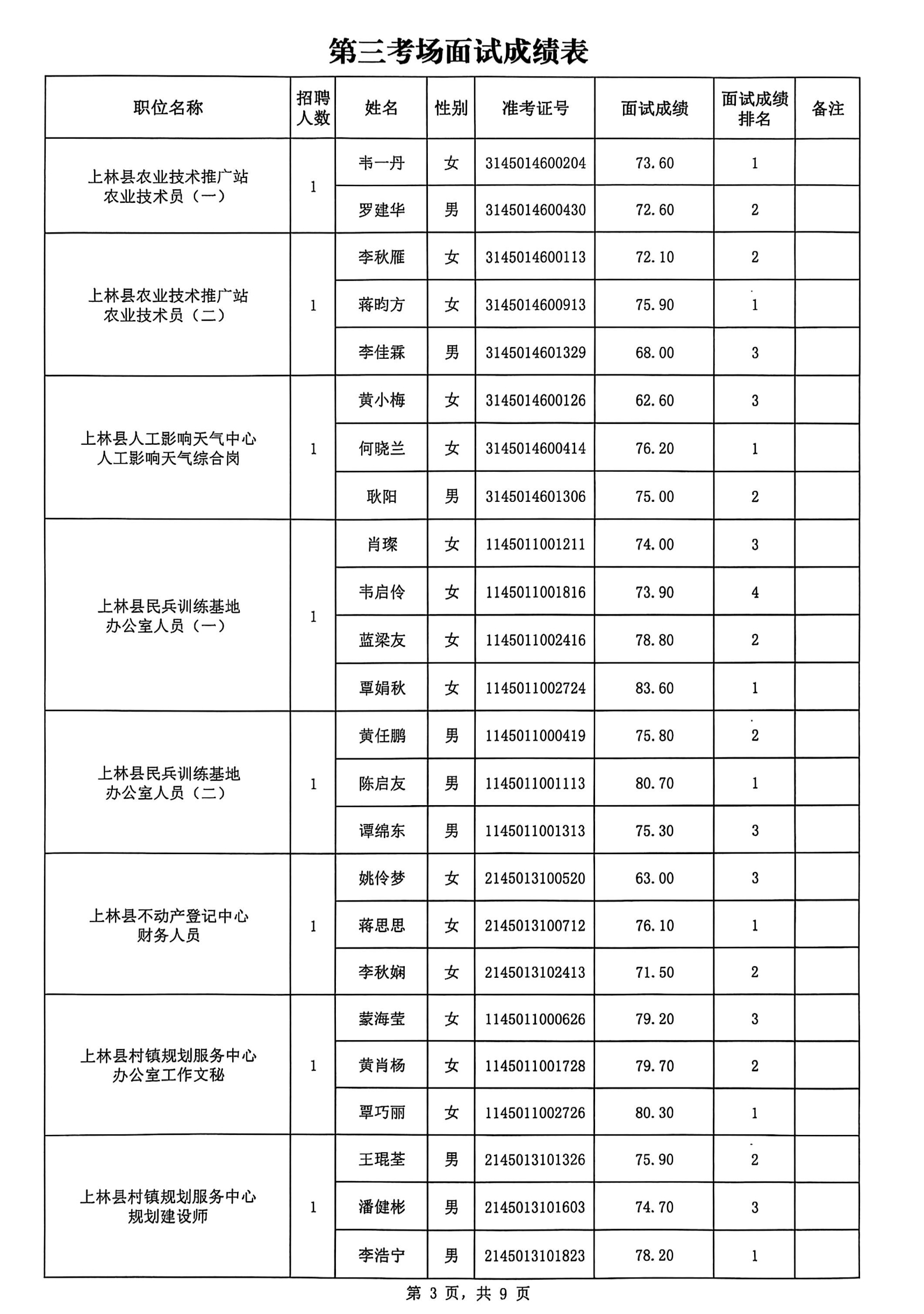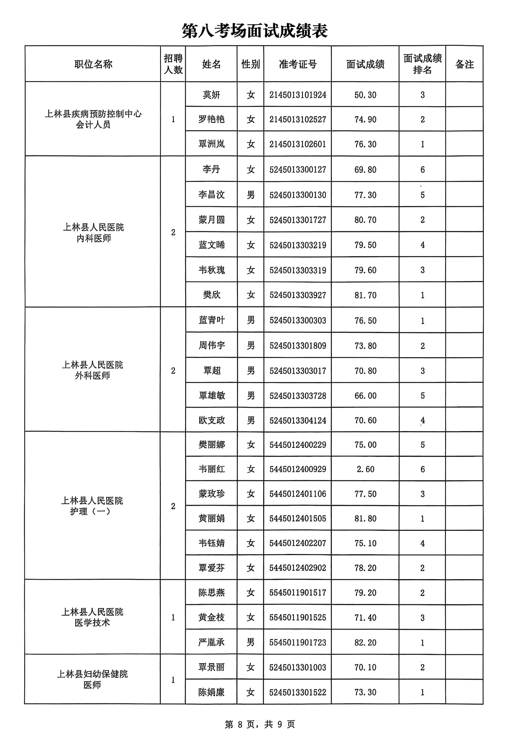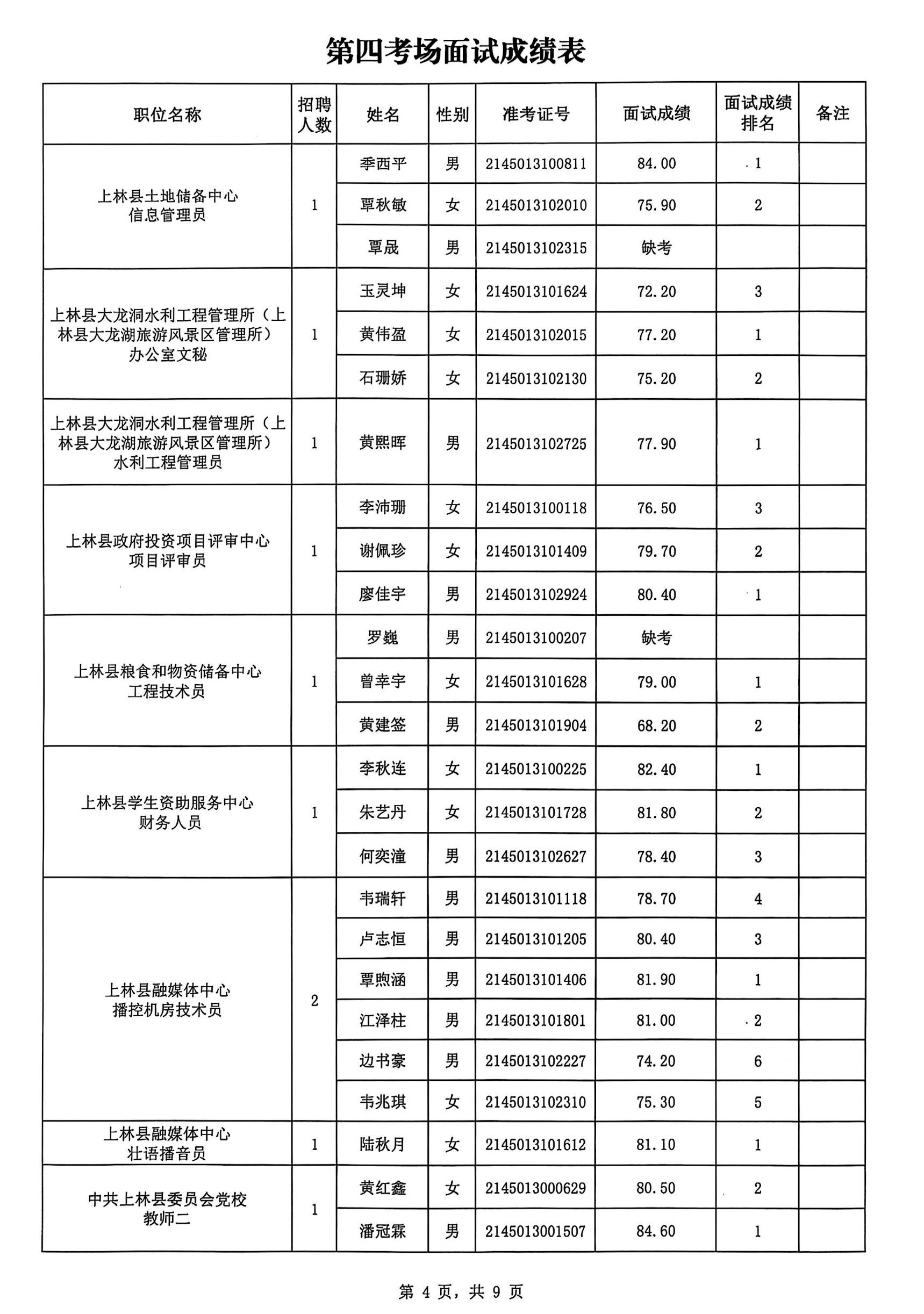 上林縣2025年公開(kāi)考試招聘事業(yè)單位工作人員面試成績(jī)