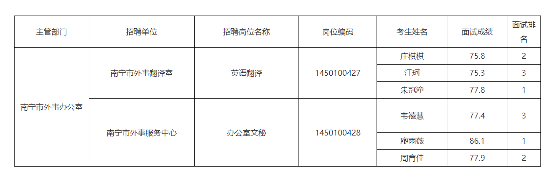 南寧市外事辦公室2025年公開考試招聘事業(yè)單位工作人員面試成績(jī)表