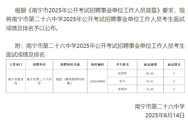 原文標(biāo)題:南寧市第二十六中學(xué)關(guān)于公布2025年公開(kāi)考試招聘事業(yè)單位工作人員考生面試成績(jī)及排名的公告