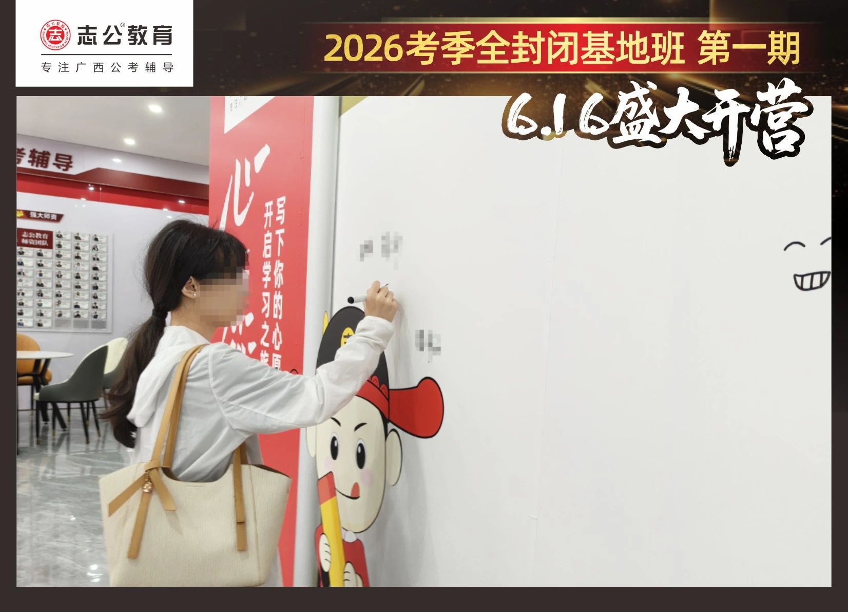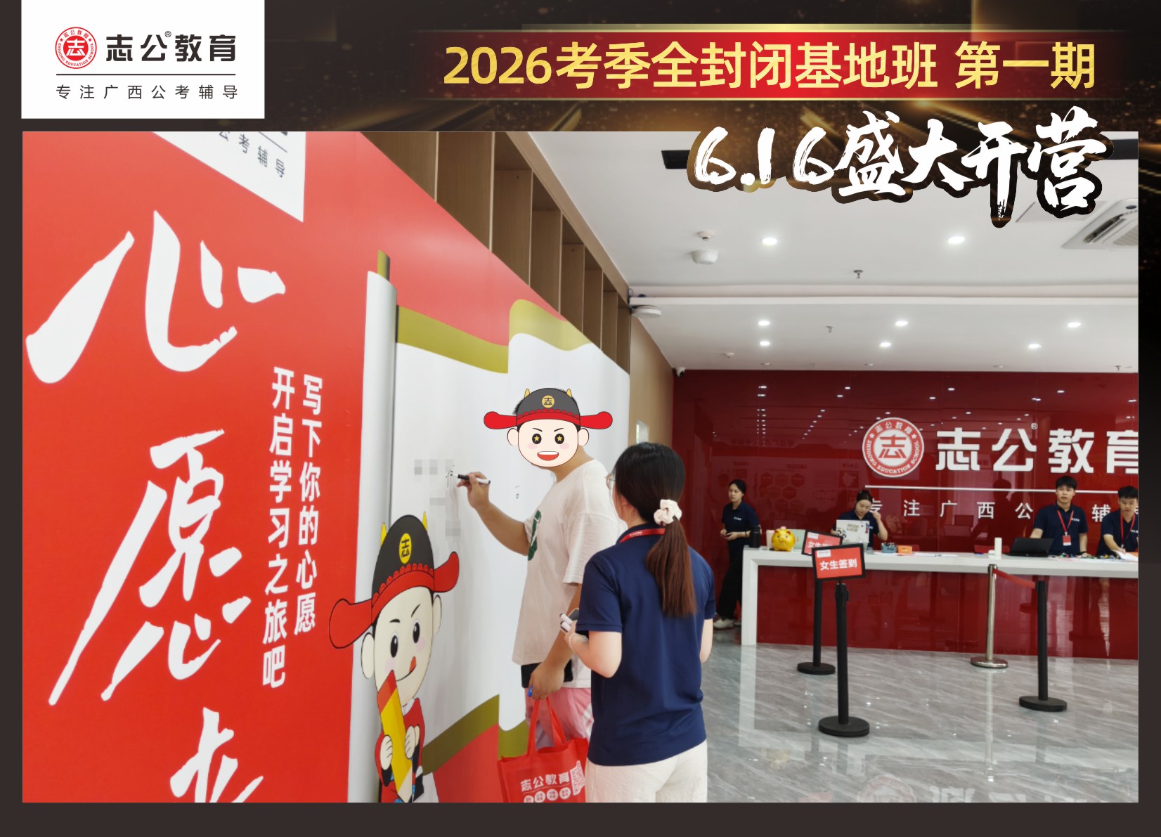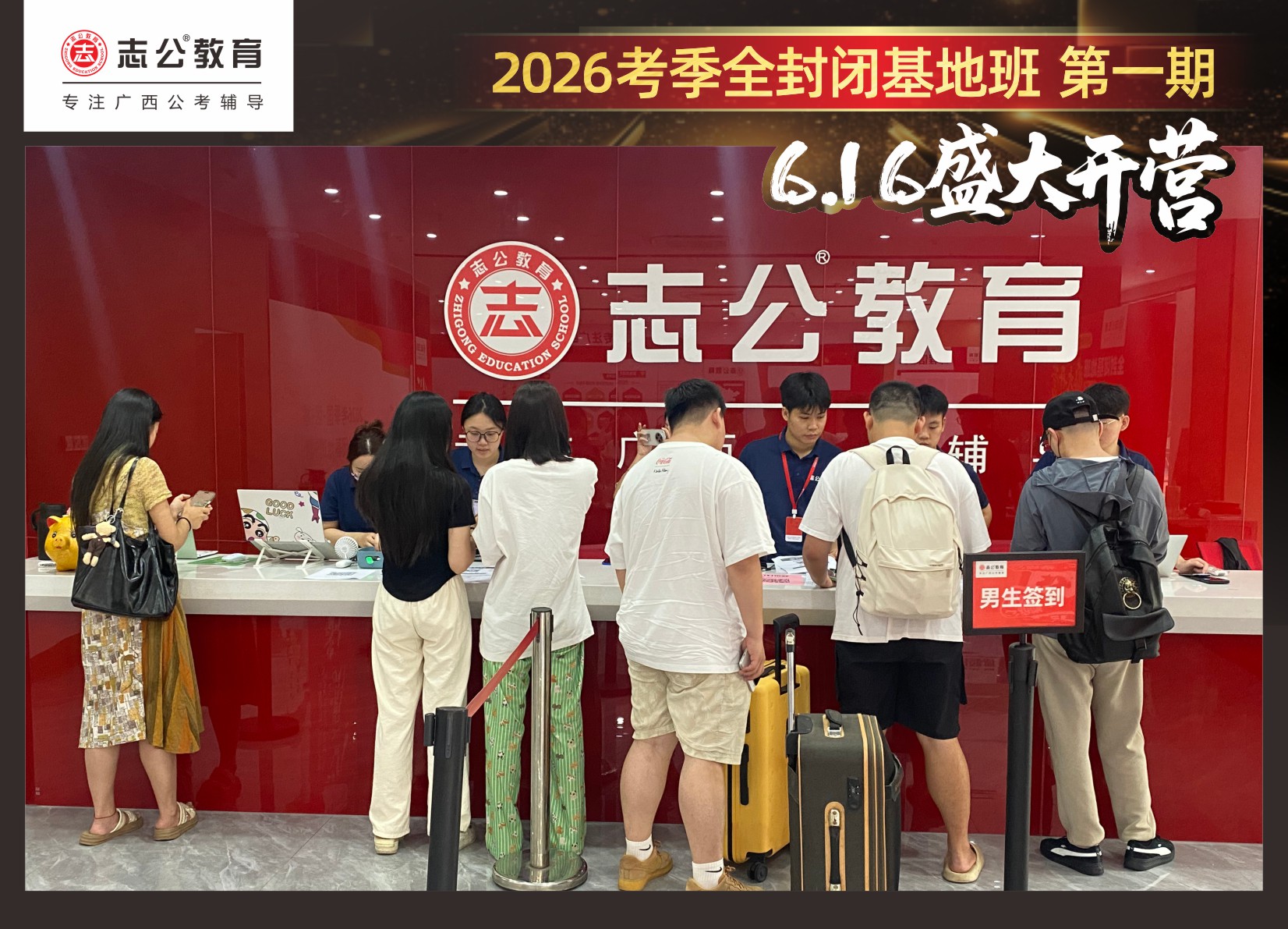由于這段時(shí)間受臺(tái)風(fēng)影響,南寧迎來(lái)下雨天,但學(xué)員們滿(mǎn)懷先一步備考,快一步成功圓夢(mèng)的滿(mǎn)滿(mǎn)炙熱信心,早早就在志公教育(中關(guān)村)全封閉基地前臺(tái)等候,6月16日,志公教育26考季全封閉基地班第1期的學(xué)員們齊聚一堂,正式開(kāi)啟他們的公考備戰(zhàn)之旅。簽到環(huán)節(jié)作為基地班課程的第一站,不僅是對(duì)學(xué)員們的歡迎儀式,更是他們邁向夢(mèng)想的第一步。