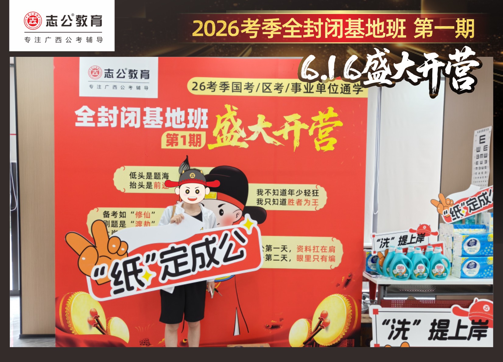 今天的開(kāi)班還有一系列小活動(dòng)噢~瞧!——“學(xué)員打卡活動(dòng)”,所有今天到場(chǎng)的基地班學(xué)員,通過(guò)做一些小任務(wù)的方式,可以到前臺(tái)領(lǐng)取生活禮包即可領(lǐng)取生活禮品1份(一提六包的紙巾,或者一瓶洗衣液),這也是志公教育對(duì)所有學(xué)員的美好祝愿,預(yù)祝大家未來(lái)能夠“紙”定成公,“洗”提上/岸,“衣舉成公”!