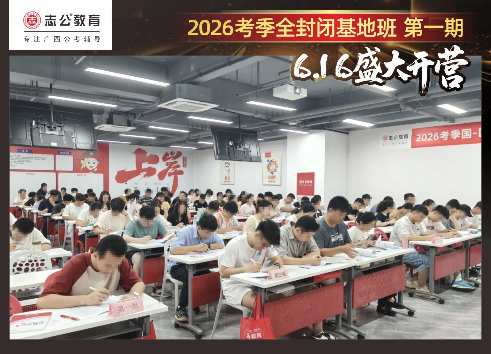 大家稍作休息之后,就是咱們期待已久的開(kāi)班典禮啦!學(xué)員們?cè)诎嘀魅蔚囊龑?dǎo)下分組就坐。大家目光灼灼,熱情高漲,迫不及待想要開(kāi)啟學(xué)習(xí)模式??催@座無(wú)虛席的盛況,志公26考季全封閉基地班第1期課程實(shí)力名不虛傳,各位學(xué)員用飽滿(mǎn)的熱情和積極的態(tài)度迎接此次課程的開(kāi)展,期待大家能夠完成自己的蛻變和成長(zhǎng)!