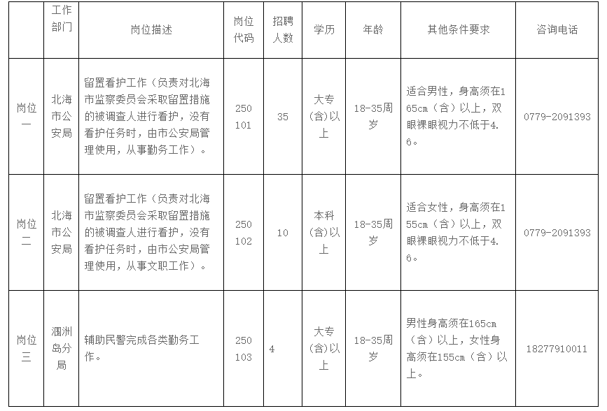 有關(guān)招聘信息,應(yīng)聘人員可登錄北海市人才網(wǎng)(www.bhrc.cn)、北海市公安局微信公眾號“北海公安”查詢。咨詢報(bào)考崗位、資格條件等信息,可在工作時(shí)間內(nèi)致電各崗位咨詢電話。