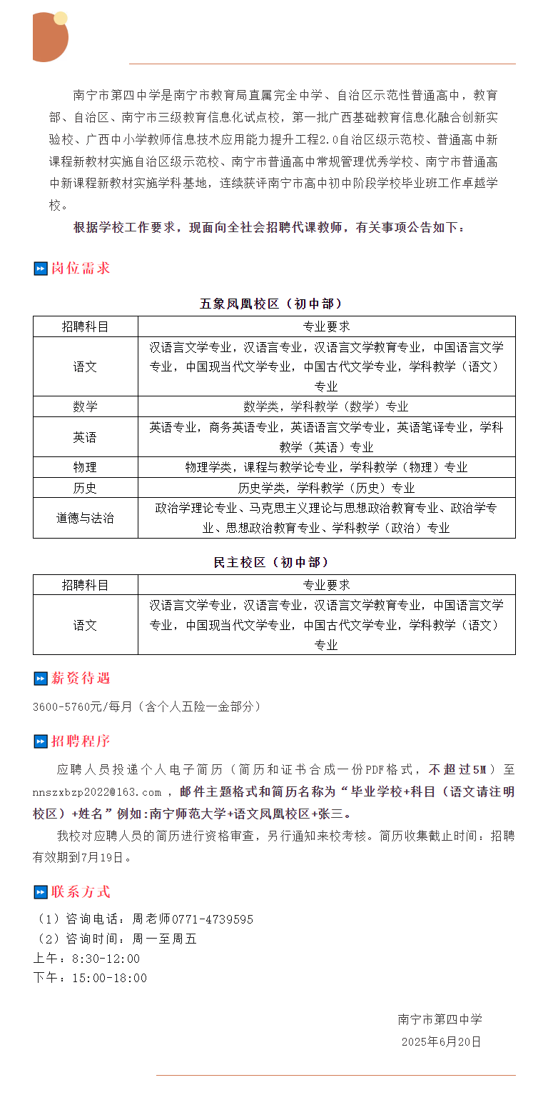 2025年南寧市第四中學(xué)代課教師招聘公告