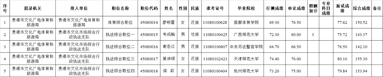 6.6 貴港市文化廣電體育和旅游局2025年度考試錄用公務(wù)員擬錄用人員名單