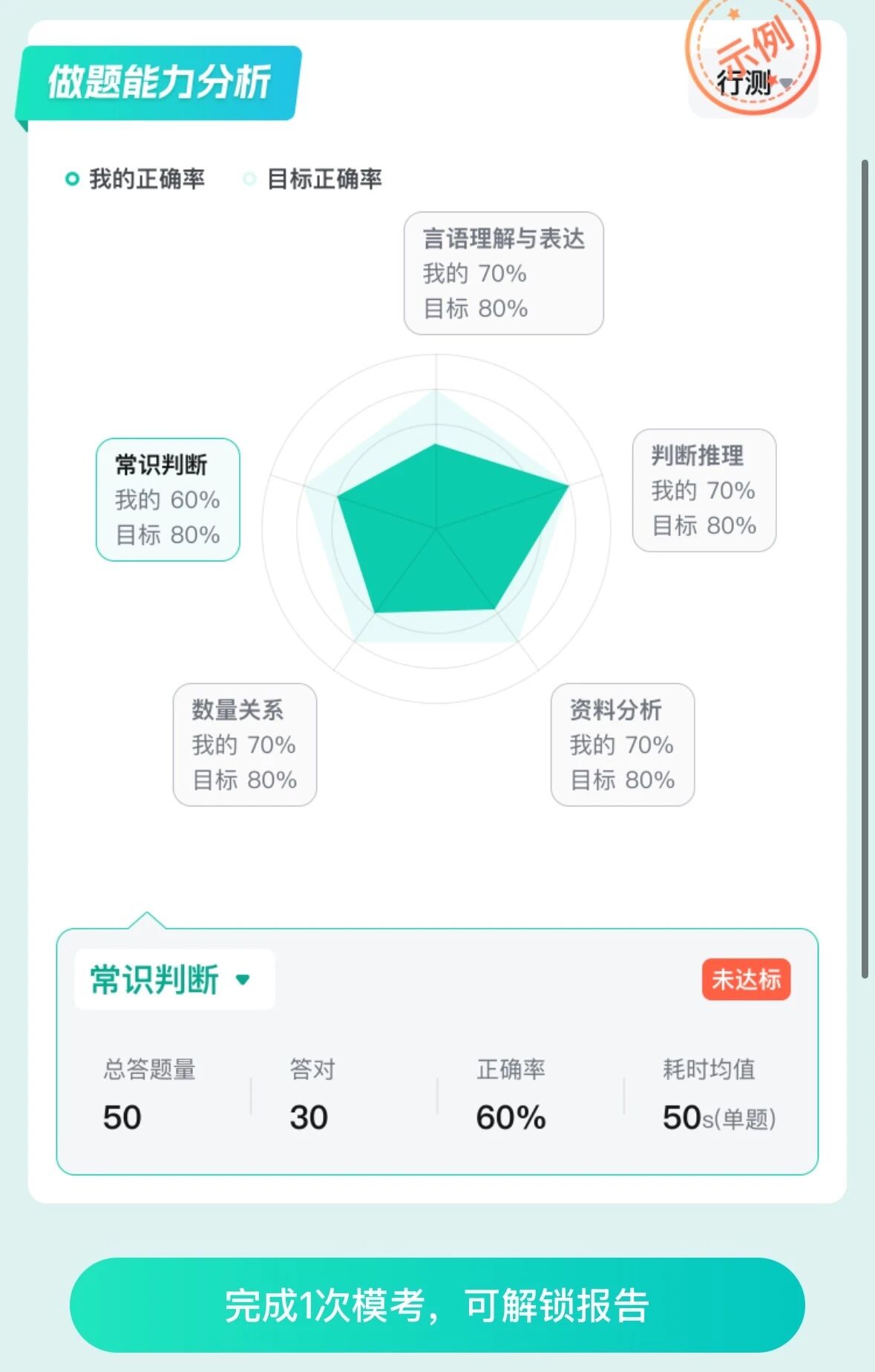 3??生成個(gè)人模考報(bào)告:考完就能查看模考成績(jī)、排名及解析,生成的個(gè)人模考報(bào)告包含各模塊正確率分布、做題能力分析、筆試分?jǐn)?shù)yu測(cè)等內(nèi)容。