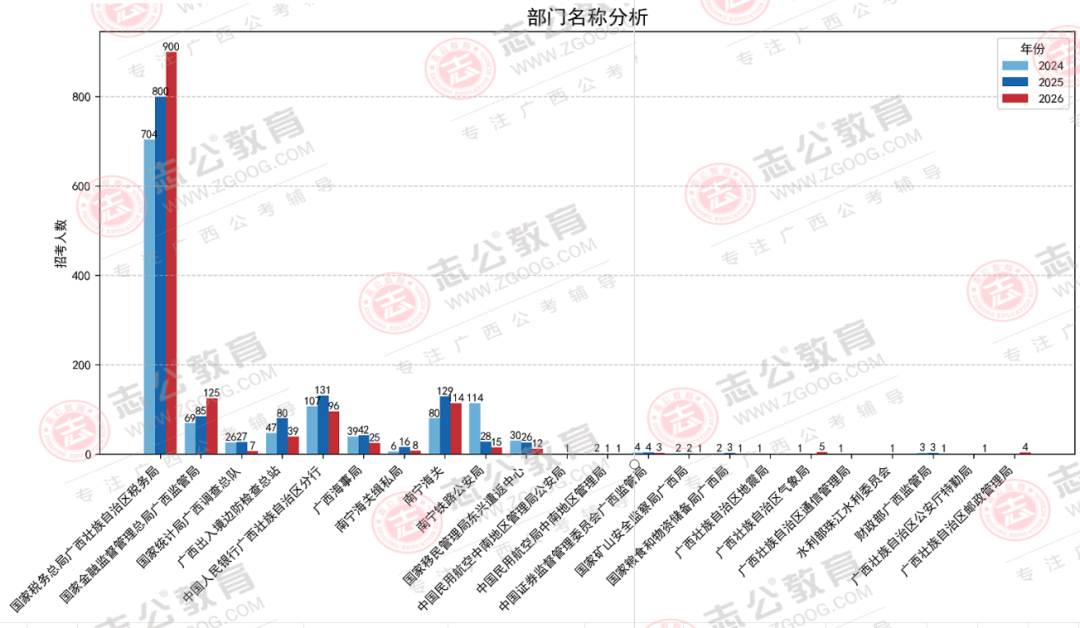 在今年,廣西國(guó)稅系統(tǒng)這個(gè)招考“大戶(hù)”,招錄漲到了900人,職位數(shù)占比66%。此外,國(guó)家金融監(jiān)督管理總局廣西監(jiān)管局招125人,呈正增長(zhǎng),與2025年國(guó)考相比漲幅47%。南寧海關(guān)從2025年招錄129人,2026年只招錄114人,相比縮減了11.63人。