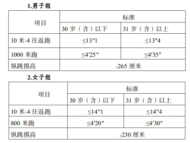 測評結(jié)果分為合格和不合格。一般體能測評三項成績均達(dá)標(biāo)的方為合格,其中具有研究生及以上學(xué)歷報考人員,體能測評三個項目中有任兩項達(dá)標(biāo)的,即視為合格。體能測試時間2月下旬,地點:平桂區(qū)體育場。